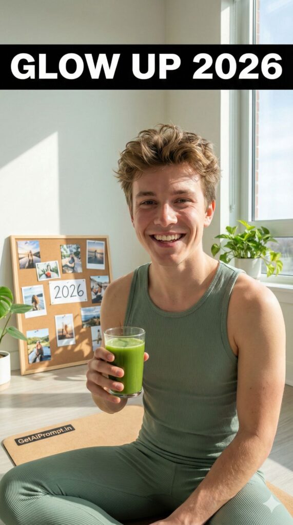 A bright, "clean girl" aesthetic shot based on the uploaded image, featuring the subject with [100% identical and same face in uploaded images] in a sun-drenched yoga studio or minimalist apartment. They are wearing matching [OUTFIT: sage green aloe yoga set, beige loungewear]. They are holding a green juice and smiling radiantly. In the background, a physical vision board is visible with "2026" written on it. The vibe is health and peace. Embedded Branding: The text "GetAiPrompt.in" is written on the yoga mat label. Top Bar: A horizontal black bar at the very top edge containing the text "GLOW UP 2026" in bold white cinematic font. --ar 9:16