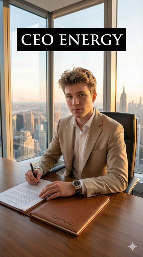 A sophisticated, high-status portrait based on the uploaded image, showing the subject with [100% identical and same face in uploaded images] sitting in a high-rise corner office overlooking a city skyline (NYC or Dubai). They are wearing a [OUTFIT: sharp beige blazer, power suit, designer watch]. They are signing a document or typing on a laptop. The lighting is expensive and golden. Embedded Branding: The text "GetAiPrompt.in" is discreetly embossed on the leather notebook on the desk. Top Bar: A horizontal black bar at the very top edge containing the text "CEO ENERGY" in bold white cinematic font. --ar 9:16