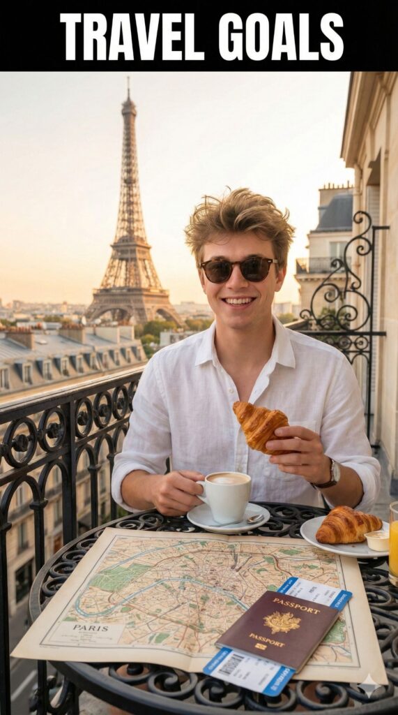 An dreamy travel lifestyle shot based on the uploaded image, capturing the subject with [100% identical and same face in uploaded images] having breakfast on a balcony in [LOCATION: Paris with Eiffel Tower view, Santorini with ocean view, Bali Jungle]. They are wearing [OUTFIT: a chic vacation dress, linen shirt and sunglasses]. A vintage map and a passport are on the table. The vibe is freedom. Embedded Branding: The text "GetAiPrompt.in" is printed on the boarding pass sticking out of the passport. Top Bar: A horizontal black bar at the very top edge containing the text "TRAVEL GOALS" in bold white cinematic font. --ar 9:16