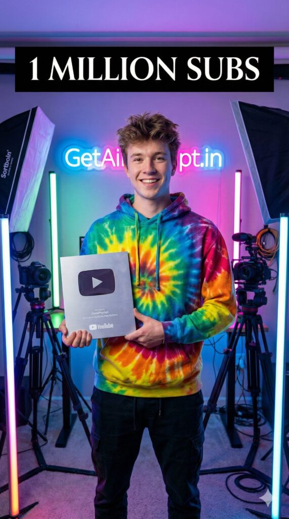 A cool, neon-lit studio shot based on the uploaded image, showing the subject with [100% identical and same face in uploaded images] holding a camera or posing with a Silver Play Button. They are wearing [OUTFIT: trendy streetwear, colorful hoodie]. The background is filled with RGB lights and filming equipment. They look confident and famous. Embedded Branding: The text "GetAiPrompt.in" is a neon sign on the wall behind them. Top Bar: A horizontal black bar at the very top edge containing the text "1 MILLION SUBS" in bold white cinematic font. --ar 9:16