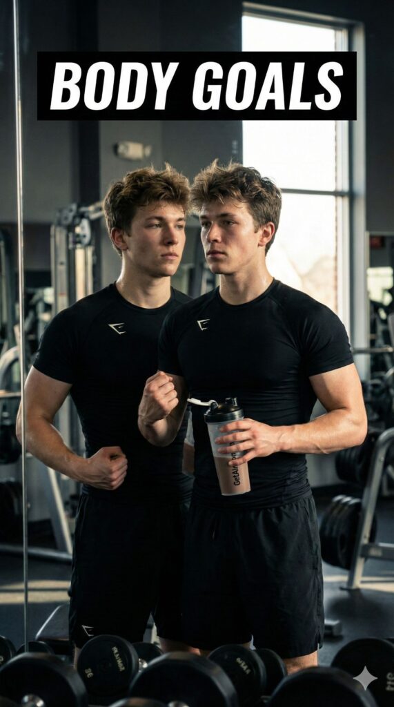 A high-energy gym aesthetic shot based on the uploaded image, capturing the subject with [100% identical and same face in uploaded images] looking in the gym mirror. They have their dream physique (fit and toned). They are wearing [OUTFIT: premium gym shark set, compression gear]. They are holding a protein shaker. The lighting is dramatic and motivating. Embedded Branding: The text "GetAiPrompt.in" is the logo on the shaker bottle. Top Bar: A horizontal black bar at the very top edge containing the text "BODY GOALS" in bold white cinematic font. --ar 9:16