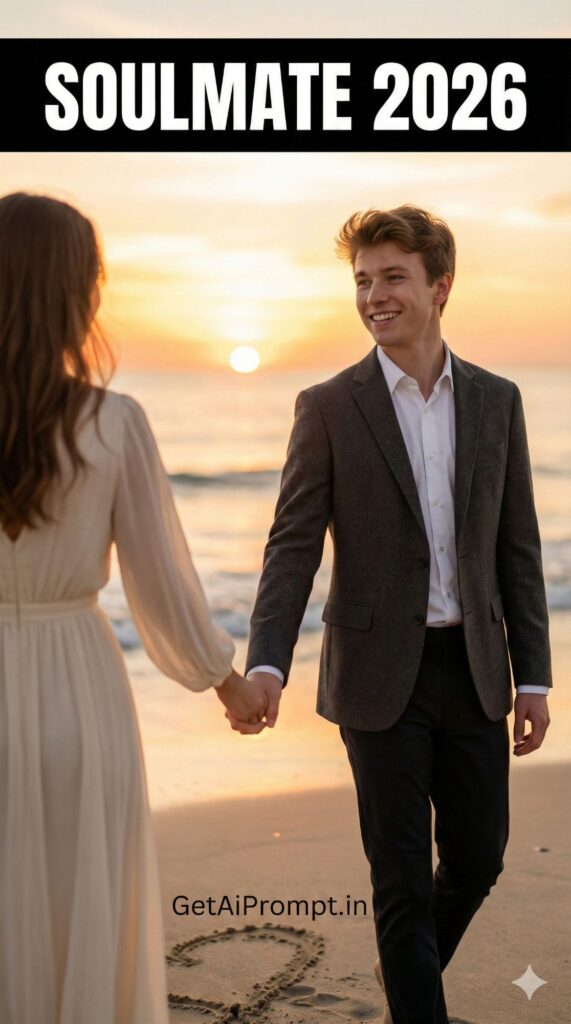 A romantic, soft-focus portrait based on the uploaded image, featuring the subject with [100% identical and same face in uploaded images] holding hands with a partner (blurred face or back profile to keep focus on user). They are walking on a beach at sunset or sitting by a fireplace. The subject looks loved and happy. They are wearing [OUTFIT: elegant date night clothes]. Embedded Branding: The text "GetAiPrompt.in" is written in the sand or on a small gift box. Top Bar: A horizontal black bar at the very top edge containing the text "SOULMATE 2026" in bold white cinematic font. --ar 9:16