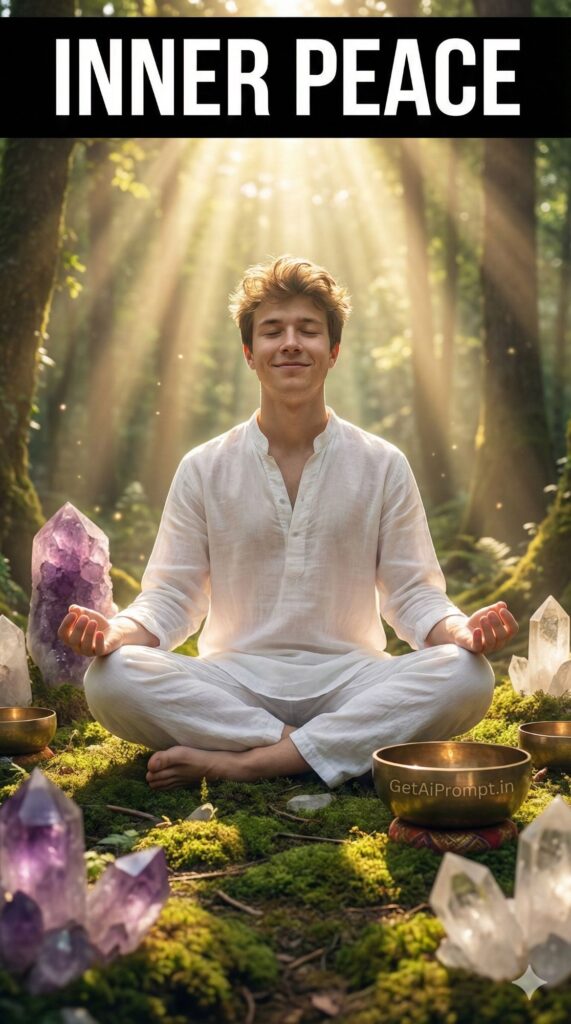 A spiritual, ethereal portrait based on the uploaded image, showing the subject with [100% identical and same face in uploaded images] meditating in a beautiful nature spot (forest or mountain top). They are surrounded by crystals and singing bowls. They are wearing [OUTFIT: flowing white linen clothes]. The lighting is magical, with sun rays (God rays) illuminating them. Embedded Branding: The text "GetAiPrompt.in" is engraved on a singing bowl. Top Bar: A horizontal black bar at the very top edge containing the text "INNER PEACE" in bold white cinematic font. --ar 9:16