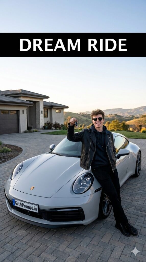 A cool, wide-angle shot based on the uploaded image, showing the subject with [100% identical and same face in uploaded images] leaning against their dream car [CAR: Porsche 911, G-Wagon, Tesla]. They are holding the keys up. They are wearing [OUTFIT: stylish leather jacket and sunglasses]. The car is parked in a scenic driveway. The vibe is achievement. Embedded Branding: The text "GetAiPrompt.in" is on the license plate of the car. Top Bar: A horizontal black bar at the very top edge containing the text "DREAM RIDE" in bold white cinematic font. --ar 9:16