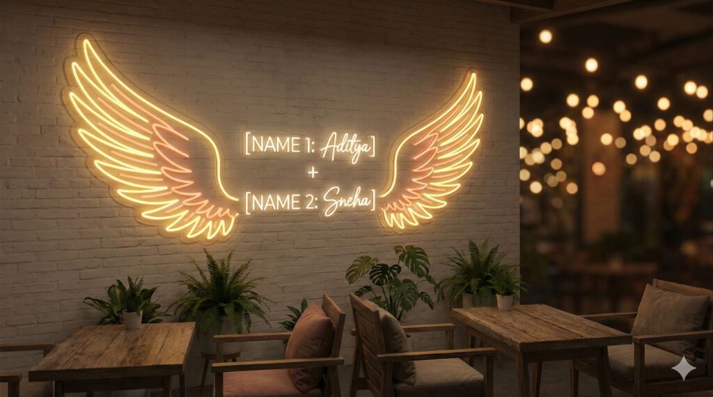 A romantic and warm 3D neon sign installation on a white whitewashed brick wall inside a cozy cafe or lounge. The Wings: A large pair of elegant, feathered angel wings made of neon tubes glowing with a soft, warm [COLOR: Golden Yellow and Peach] light. The Text: Centered between the wings are the names "[NAME 1: Aditya] + [NAME 2: Sneha]" written in a delicate, flowing script neon font, glowing warm white. Atmosphere: Soft, diffused light. The glow illuminates rustic wooden furniture and potted plants below. The vibe is intimate and dreamy. Bokeh lights in the background. --ar 16:9
