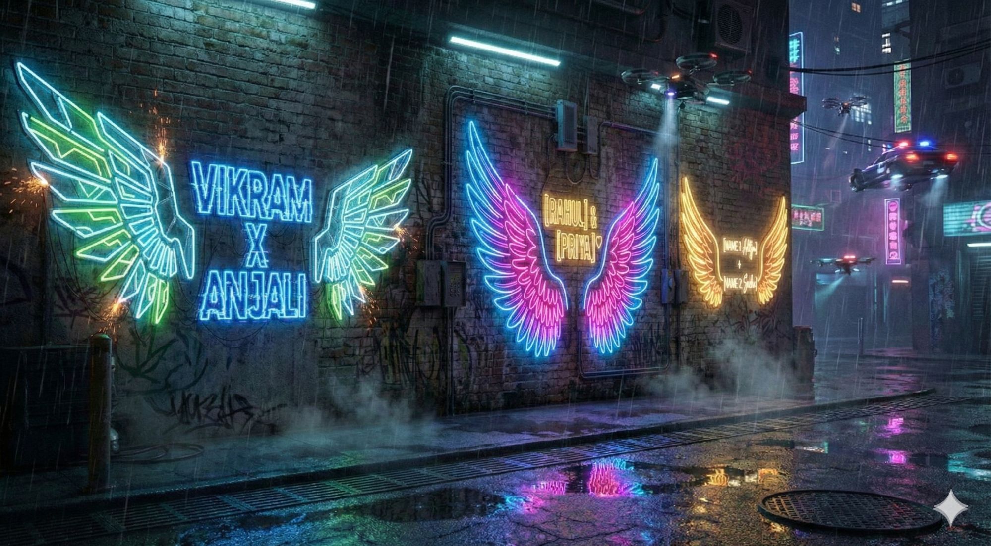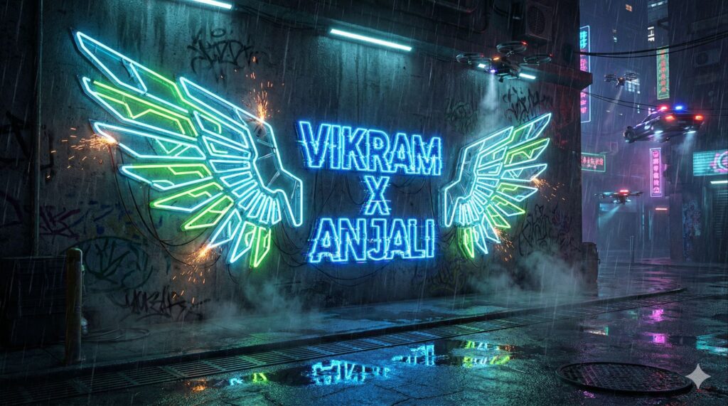 A futuristic, cyberpunk-style 3D neon installation on a dark, graffiti-covered concrete wall in a rainy futuristic city alley. The Wings: Massive, mechanical-style angel wings with geometric patterns, made of neon tubes glowing with [COLOR: Ice Blue and Acid Green] light. Sparks occasionally fly from the wires. The Text: Between the wings, the names "[NAME 1: VIKRAM] X [NAME 2: ANJALI]" are in a bold, glitchy, futuristic neon font, glowing electric blue with a digital distortion effect. Atmosphere: Wet ground reflecting the neon and city lights. Steam rising from grates. High tech, gritty, cinematic. --ar 16:9