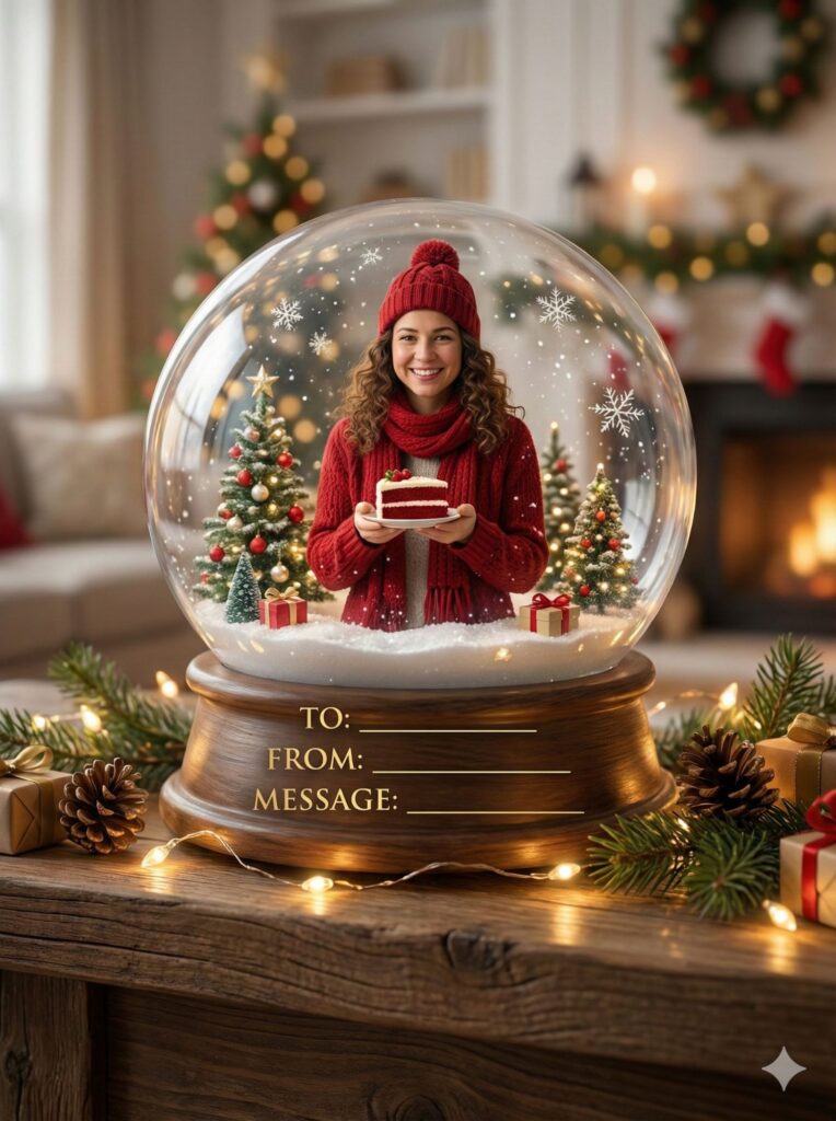 A stunning Christmas card template centered around a hyper-realistic, magical glass snow globe. Inside the snow globe is a miniature, cozy winter scene featuring the subject(s) from the uploaded image with [100% identical and same face in uploaded images], smiling and wearing winter clothes amidst falling snow and tiny decorated trees. The globe sits on a rustic wooden mantelpiece surrounded by glowing fairy lights and pinecones. Below the globe, elegant gold foil text placeholders read: "TO: ____", "FROM: ____", "MESSAGE: ____". The overall vibe is warm and nostalgic. --ar 3:4