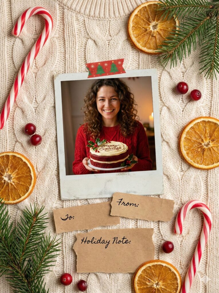 A cozy, flat-lay style Christmas card aesthetic. The background is a knitted cream cable-knit sweater texture. Scattered around are candy canes and dried orange slices. In the center, a realistic "Polaroid" style photo print shows the subject(s) from the uploaded image with [100% identical and same face in uploaded images] in festive attire. The Polaroid is held by festive washi tape. Below it, handwritten-style text areas on torn kraft paper read: "To:", "From:", "Holiday Note:". It feels handmade and personal. --ar 3:4