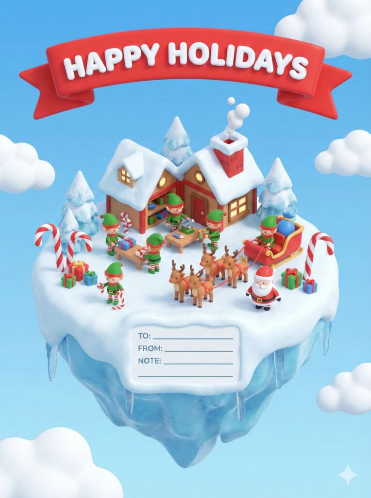 A playful, cute 3D isometric render of the North Pole. Tiny elves, reindeer, and Santa's workshop are rendered in a charming, toy-like style on a floating snowy island. Clouds float around it. A large banner across the top reads "HAPPY HOLIDAYS". On the snowy base of the island, clean text areas are designated: "TO:", "FROM:", "NOTE:". The colors are cheerful reds, greens, and icy blues. --ar 3:4