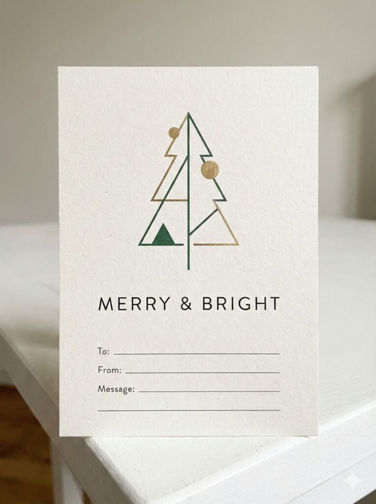 A clean, sophisticated minimalist Christmas card. The background is a textured off-white recycled paper. A simple, artistic illustration of a abstract Christmas tree made of minimalist geometric lines in forest green and muted gold is at the top. Below it, in a clean, modern sans-serif font, the template reads: "MERRY & BRIGHT". Followed by minimalist lines for: "To:", "From:", "Message:". The vibe is calm, peaceful, and stylish. --ar 3:4