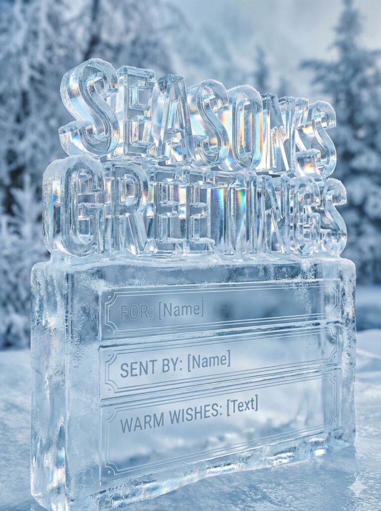 A stunning 3D card where everything is carved from clear, pristine ice. The text "SEASON'S GREETINGS" is a detailed ice sculpture catching and refracting cold blue and white light into rainbows. The background is a blurred frozen landscape. Below the ice text, frosted glass panels are provided for text: "FOR: [Name]", "SENT BY: [Name]", "WARM WISHES: [Text]". It looks cold to the touch but beautiful. --ar 3:4