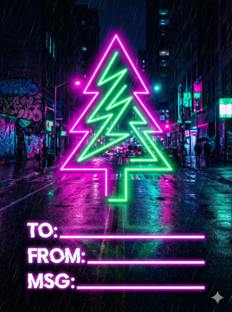 An edgy, modern Christmas card for a younger crowd. The background is a dark, wet city street reflecting lights. A neon sign shaped like a Christmas tree glows intensely in electric pink and green. Below it, glowing neon text placeholders read: "TO:___", "FROM:___", "MSG:___". The vibe is cool, late-night, and electric. --ar 3:4