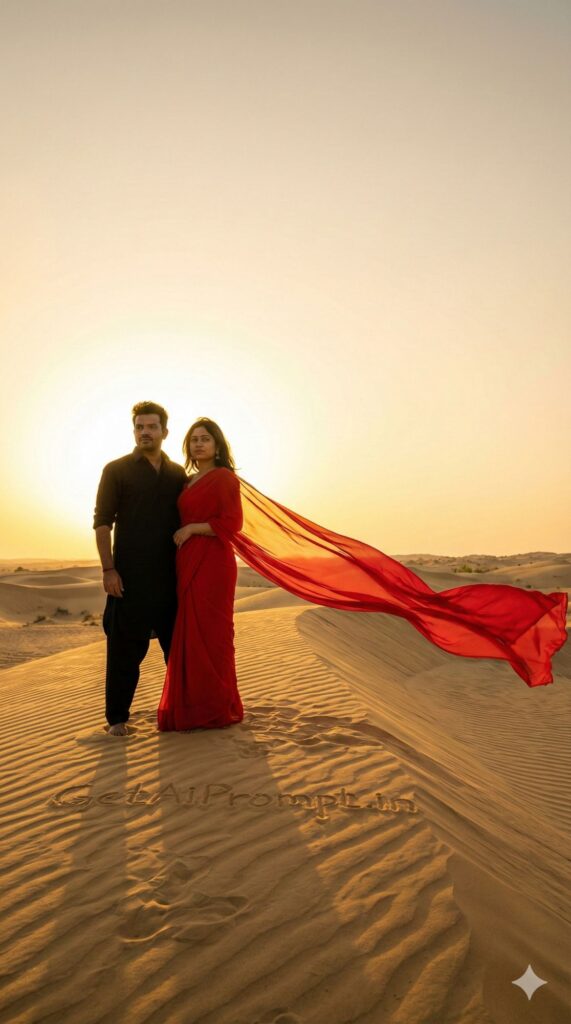 cinematic wide shot of an Indian couple on a sand dune, [same 100% identical face uploaded], [SKIN_TONE: Golden hour glow], wearing [OUTFIT: Man in Black Pathani Suit, Woman in Red Chiffon Saree with extra long pallu], [LOCATION: Sam Sand Dunes Jaisalmer], [ACTION: Standing on the peak of a dune, strong wind blowing the saree pallu dramatically behind like a trail], [EMOTION: Heroic, romantic, epic], [LIGHTING: Golden sunset creating long shadows], [DETAILS: Ripples in the sand], brand embedding "GetAiPrompt.in" written in the sand dune, 8K, movie poster aesthetic, --ar 9:16