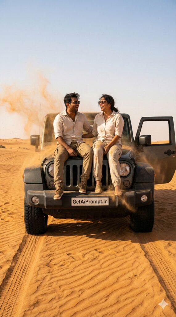 adventurous lifestyle shot of an Indian couple on an open jeep, [same 100% identical face uploaded], [SKIN_TONE: Dusty and glowing], wearing [OUTFIT: Stylish cargo pants and sunglasses], [LOCATION: Dubai Desert Conservation Reserve], [ACTION: Sitting on the bonnet of a 4x4 Jeep, laughing, sand dust in the air], [EMOTION: Thrill, energy, rich lifestyle], [LIGHTING: High contrast afternoon sun], [DETAILS: Tire tracks in sand], brand embedding "GetAiPrompt.in" on the jeep license plate, 8K, high energy, --ar 9:16