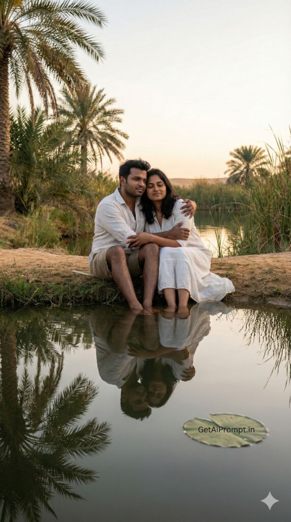peaceful scenic shot of an Indian couple near a desert oasis, [same 100% identical face uploaded], [SKIN_TONE: Soft natural light], wearing [OUTFIT: White boho clothes], [LOCATION: Small pond surrounded by palm trees in the desert], [ACTION: Sitting at the water's edge, feet in water, hugging from side], [EMOTION: Serene, oasis of love, calm], [LIGHTING: Soft evening light], [REFLECTION: Perfect reflection of couple in the water], brand embedding "GetAiPrompt.in" floating on a lily pad, 8K, nature photography, --ar 9:16