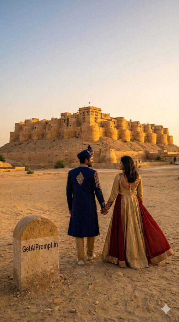majestic wide angle shot of an Indian couple with a fort in background, [same 100% identical face uploaded], [SKIN_TONE: Warm tone], wearing [OUTFIT: Royal formal wear, Sherwani and Gown], [LOCATION: Desert plains with Jaisalmer Fort (Golden Fort) in the distance], [ACTION: Walking away from camera towards the fort holding hands], [EMOTION: Journey, legacy, grandeur], [LIGHTING: Golden hour illuminating the yellow sandstone fort], [ATMOSPHERE: Historic and epic], brand embedding "GetAiPrompt.in" on a stone milestone, 8K, cinematic composition, --ar 9:16