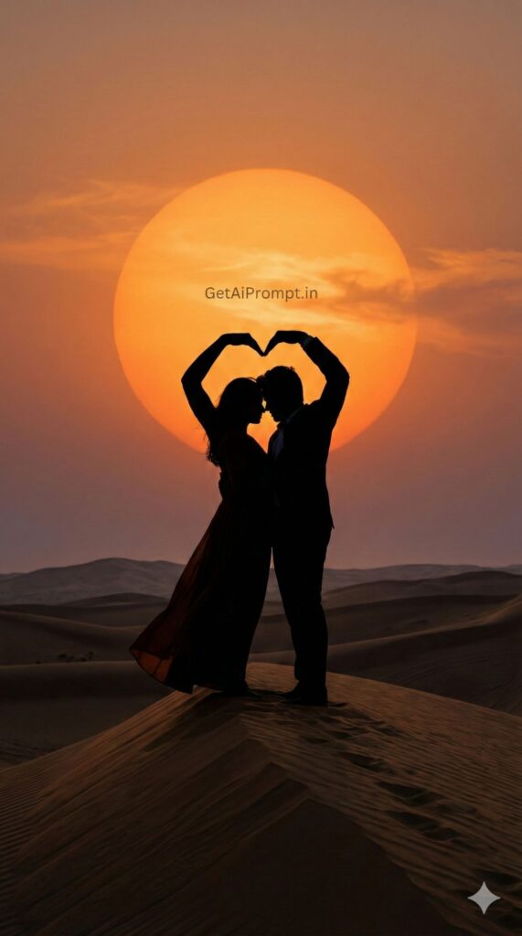 artistic silhouette shot of an Indian couple on a dune crest, [same 100% identical face uploaded], [SKIN_TONE: Black silhouette], wearing [OUTFIT: Outline of flowing dress and suit], [LOCATION: Highest sand dune], [ACTION: Standing very close, foreheads touching, creating a heart shape with arms], [EMOTION: Eternal love, passion], [LIGHTING: Giant orange sun directly behind them], [BACKGROUND: Layered dunes fading into distance], brand embedding "GetAiPrompt.in" subtly in the cloud formation, 8K, minimalist art, --ar 9:16