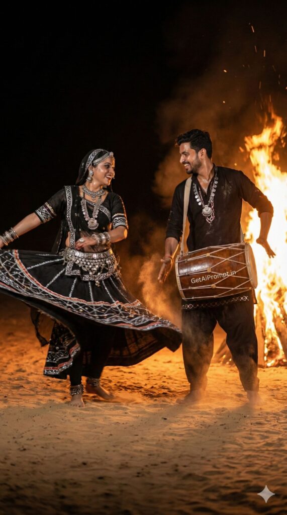 dynamic cultural shot of an Indian couple dancing, [same 100% identical face uploaded], [SKIN_TONE: Sweaty and glowing], wearing [OUTFIT: Black Kalbelia dance inspired outfit with silver jewelry], [LOCATION: Open desert floor], [ACTION: Mid-dance move, swirling skirt, man clapping/playing instrument], [EMOTION: Musical, energetic, traditional], [LIGHTING: Campfire side lighting], [DETAILS: Silver jewelry flashing in light], brand embedding "GetAiPrompt.in" on a musical instrument (Dholak), 8K, energetic and raw, --ar 9:16