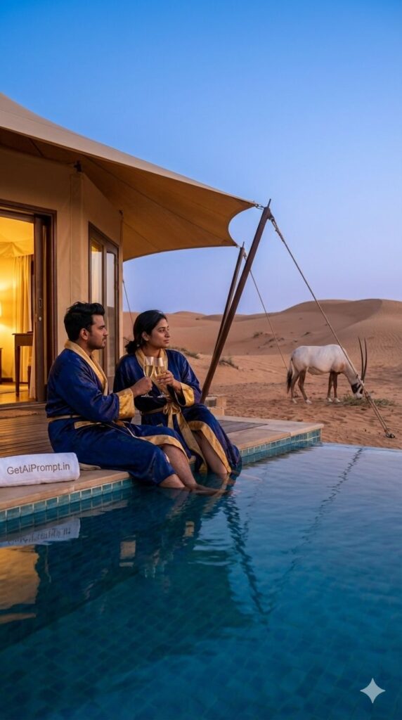 luxury lifestyle shot of an Indian couple in a desert resort, [same 100% identical face uploaded], [SKIN_TONE: Soft indoor light], wearing [OUTFIT: Silk bathrobes or evening wear], [LOCATION: Private pool deck of a luxury desert tent (like Al Maha)], [ACTION: Clinking glasses, looking out at the wildlife (Oryx/Deer) in the sand], [EMOTION: Expensive, relaxing, honeymoon], [LIGHTING: Soft twilight (Blue hour)], [DETAILS: Private pool water], brand embedding "GetAiPrompt.in" on the pool towel, 8K, luxury travel influencer, --ar 9:16