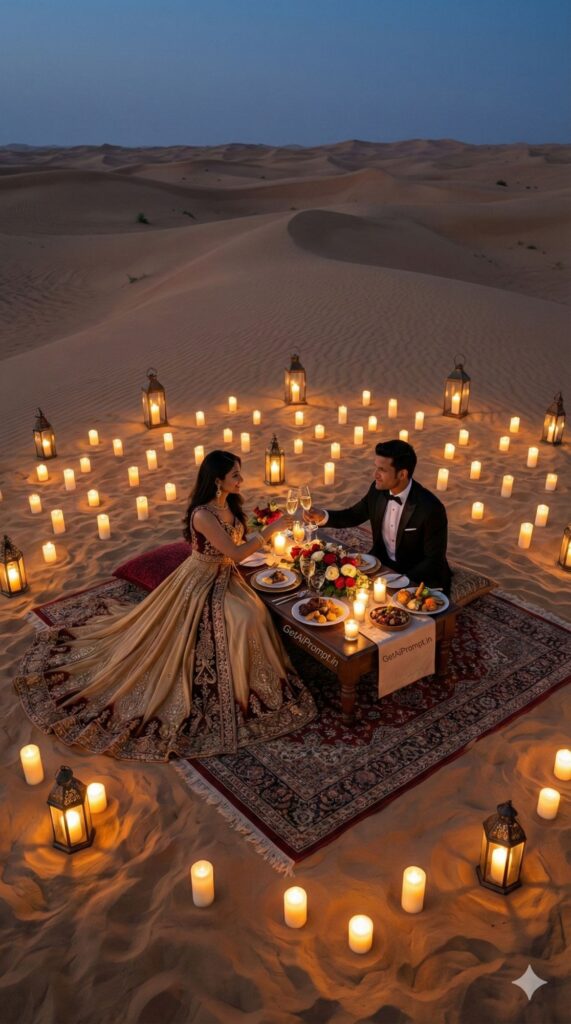 romantic aerial-style shot of a private desert dinner setup, [same 100% identical face uploaded], [SKIN_TONE: Candlelight glow], wearing [OUTFIT: Elegant evening gown and Tuxedo], [LOCATION: Middle of nowhere in the dunes], [ACTION: Sitting on Persian rugs at a low table filled with candles and food, toasting glasses], [EMOTION: "Just the two of us", intimate luxury], [LIGHTING: Soft glow of hundreds of candles on the sand], [ATMOSPHERE: Twilight blue sky], brand embedding "GetAiPrompt.in" on a menu card, 8K, cinematic romance, --ar 9:16