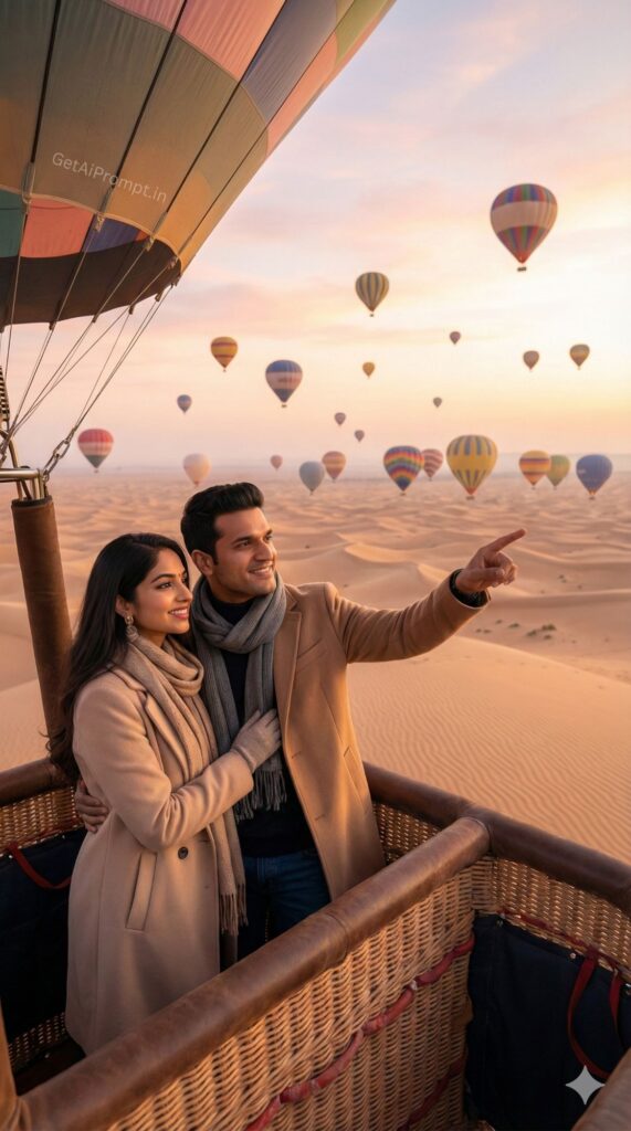 dreamy wide shot of an Indian couple in a hot air balloon basket, [same 100% identical face uploaded], [SKIN_TONE: Morning sun glow], wearing [OUTFIT: Warm stylish coats and scarves], [LOCATION: Floating high above the desert dunes at sunrise], [ACTION: Looking out over the horizon, pointing at other balloons], [EMOTION: Wonder, adventure, on top of the world], [LIGHTING: Soft pastel sunrise colors (Pink/Orange)], [BACKGROUND: Dozens of other balloons in distance], brand embedding "GetAiPrompt.in" on the balloon fabric, 8K, travel bucket list, --ar 9:16