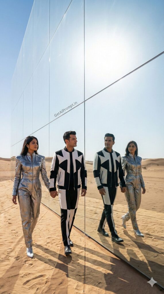 futuristic architectural shot of an Indian couple near a mirrored building (like Maraya AlUla), [same 100% identical face uploaded], [SKIN_TONE: Sharp daylight], wearing [OUTFIT: Avant-garde fashion, metallic or monochrome], [LOCATION: Desert floor next to a giant mirror wall], [ACTION: Walking hand in hand, their reflection perfectly visible in the building], [EMOTION: Cool, trendy, artistic], [LIGHTING: Bright sun reflecting off the mirror], [DETAILS: Seamless blend of sand and reflection], brand embedding "GetAiPrompt.in" as a decal on the mirror, 8K, architectural digest style, --ar 9:16