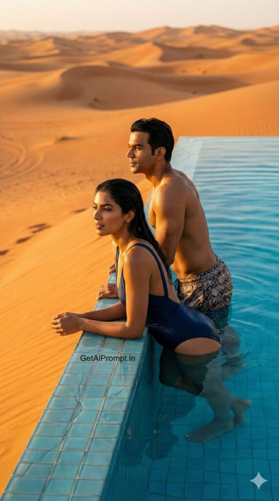 stunning contrast shot of an Indian couple in a desert infinity pool, [same 100% identical face uploaded], [SKIN_TONE: Wet and sun-kissed], wearing [OUTFIT: Luxury swimwear], [LOCATION: Infinity pool overlooking endless dunes], [ACTION: Leaning on the edge of the pool, looking out at the desert], [EMOTION: Relaxation, oasis, wealth], [LIGHTING: Golden hour hitting the sand but pool remains cool blue], [CONTRAST: Blue water vs Orange sand], brand embedding "GetAiPrompt.in" on the pool tiles, 8K, resort photography, --ar 9:16