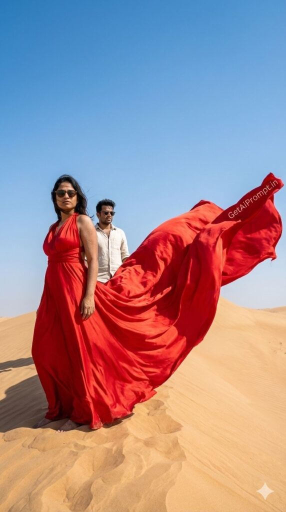 viral fashion shot of an Indian woman (solo or with partner), [same 100% identical face uploaded], [SKIN_TONE: High contrast], wearing [OUTFIT: A red gown with a 50-foot long flying train], [LOCATION: Top of a windy dune], [ACTION: The fabric is caught by the wind creating a massive red shape in the sky], [EMOTION: Dramatic, high fashion, showstopper], [LIGHTING: Bright sun to make the red pop], [DETAILS: Texture of the flying silk], brand embedding "GetAiPrompt.in" digitally on the fabric end, 8K, instagram viral art, --ar 9:16