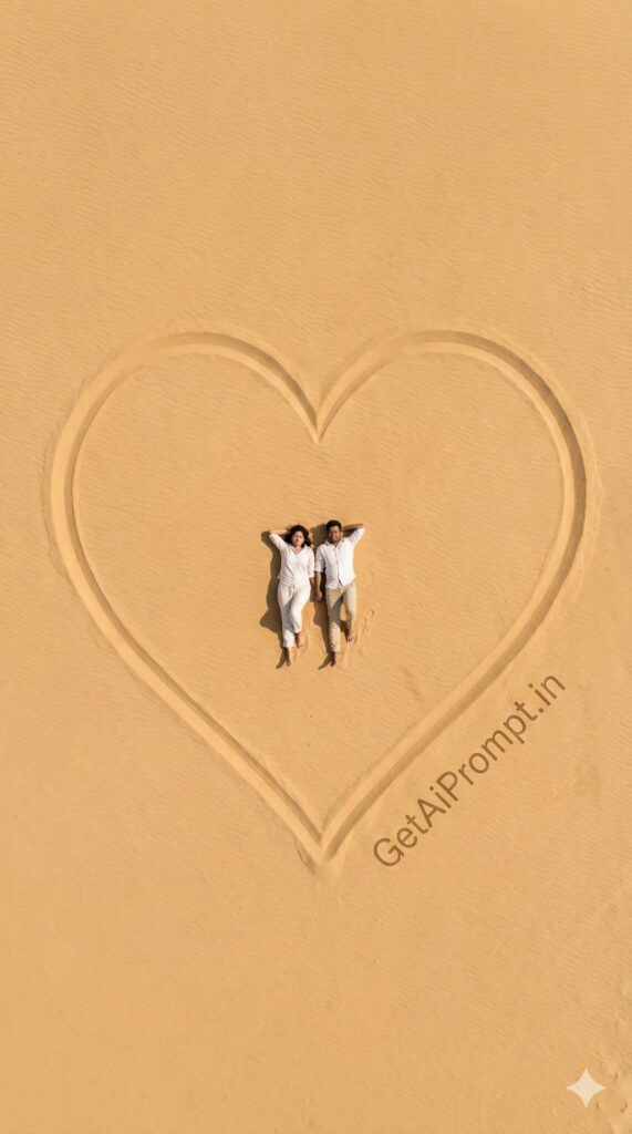 creative aerial drone shot of an Indian couple lying on the sand, [same 100% identical face uploaded], [SKIN_TONE: Small in frame], wearing [OUTFIT: contrasting white clothes], [LOCATION: Flat patch of desert sand], [ACTION: Lying inside a giant heart shape drawn in the sand], [EMOTION: playful, artistic, "big picture" love], [LIGHTING: High noon for minimal shadows], [COMPOSITION: Geometric and symmetrical], brand embedding "GetAiPrompt.in" written in sand next to them, 8K, creative drone photography, --ar 9:16