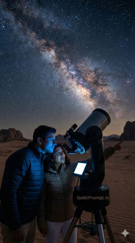 intellectual romantic night shot of an Indian couple with a telescope, [same 100% identical face uploaded], [SKIN_TONE: Blue night light], wearing [OUTFIT: Warm jackets], [LOCATION: Dark desert spot away from city lights], [ACTION: Looking through a professional telescope, pointing at stars], [EMOTION: Wonder, discovery, universe connection], [LIGHTING: Milky way visible clearly above], [DETAILS: Glowing screen of telescope], brand embedding "GetAiPrompt.in" on the telescope stand, 8K, astrophotography vibe, --ar 9:16