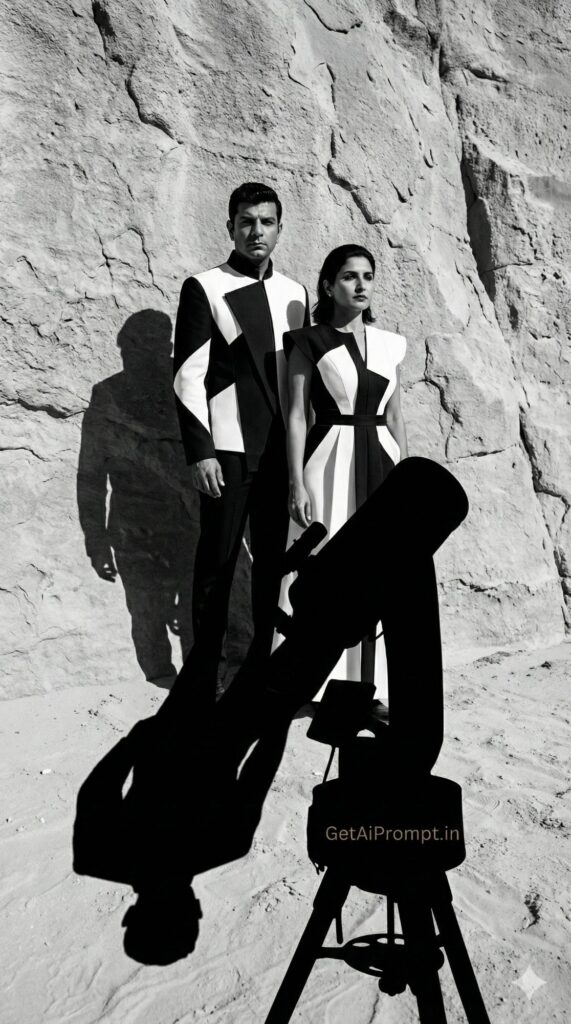 high-fashion artistic shot using shadows, [same 100% identical face uploaded], [SKIN_TONE: High contrast], wearing [OUTFIT: Sculptural fashion pieces], [LOCATION: Next to a textured desert rock or wall], [ACTION: Posing so their shadows intertwine or create a shape on the sand], [EMOTION: Edgy, serious, artistic], [LIGHTING: Harsh mid-day sun creating pitch black shadows], [COMPOSITION: Focus on the shadow play], brand embedding "GetAiPrompt.in" within the shadow shape, 8K, black and white option, --ar 9:16