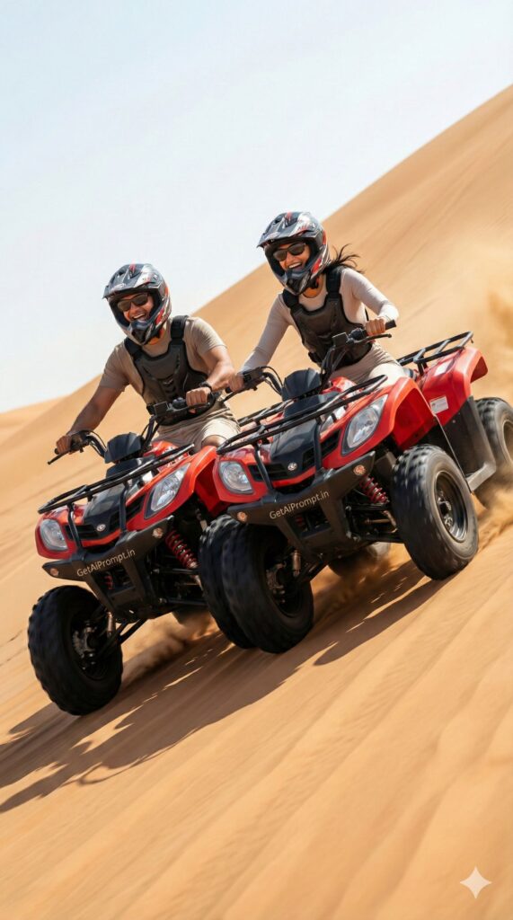 fun action shot of an Indian couple on Quad Bikes (ATVs), [same 100% identical face uploaded], [SKIN_TONE: Action blur], wearing [OUTFIT: Helmets and protective gear over stylish clothes], [LOCATION: Steep dune slope], [ACTION: Racing two quad bikes side by side, looking at each other and laughing], [EMOTION: Competitive, adrenaline date, fun], [LIGHTING: Bright daylight], [DETAILS: Sand flying from wheels], brand embedding "GetAiPrompt.in" on the ATV bumper, 8K, gopro action style, --ar 9:16