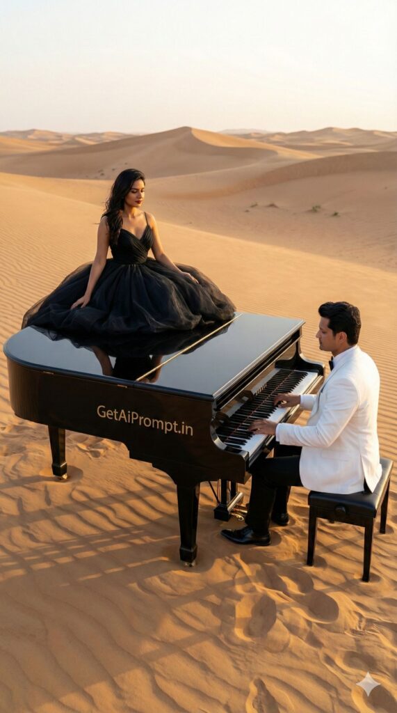 surreal artistic shot of an Indian couple with a piano in the desert, [same 100% identical face uploaded], [SKIN_TONE: Soft glow], wearing [OUTFIT: Dramatic Black Ballgown and White Tuxedo], [LOCATION: Middle of pristine sand dunes], [ACTION: Man playing a shiny Black Grand Piano placed directly on the sand, Woman sitting on top of the piano looking at him], [EMOTION: Dramatic, cinematic, musical romance], [LIGHTING: Golden hour long shadows], [SURREAL_PROP: A glossy concert grand piano in the desert], brand embedding "GetAiPrompt.in" in gold letters on the piano, 8K, music video masterpiece, --ar 9:16