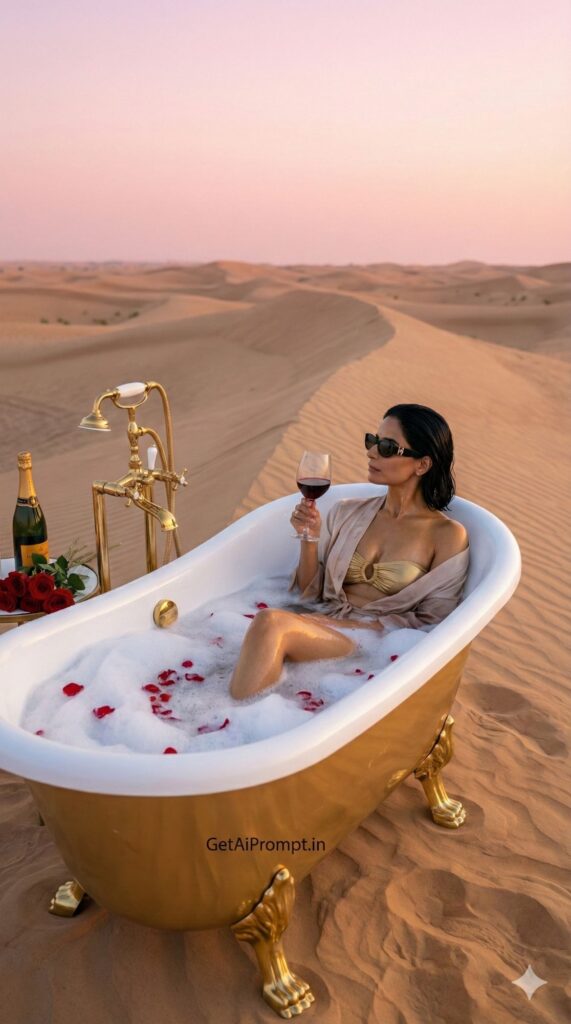 ultra-luxe editorial shot of an Indian woman (or couple) in a bathtub, [same 100% identical face uploaded], [SKIN_TONE: Wet and golden], wearing [OUTFIT: Silk robe slipping off shoulder or luxury swimwear], [LOCATION: A standalone Gold Clawfoot Bathtub placed on a high dune ridge], [ACTION: Relaxing in the tub filled with bubbles and rose petals, holding a glass of wine], [EMOTION: Unbothered, wealthy, indulgent], [LIGHTING: Soft pink sunset], [CONTRAST: Water and gold vs dry sand], brand embedding "GetAiPrompt.in" on the tub leg, 8K, vogue living style, --ar 9:16