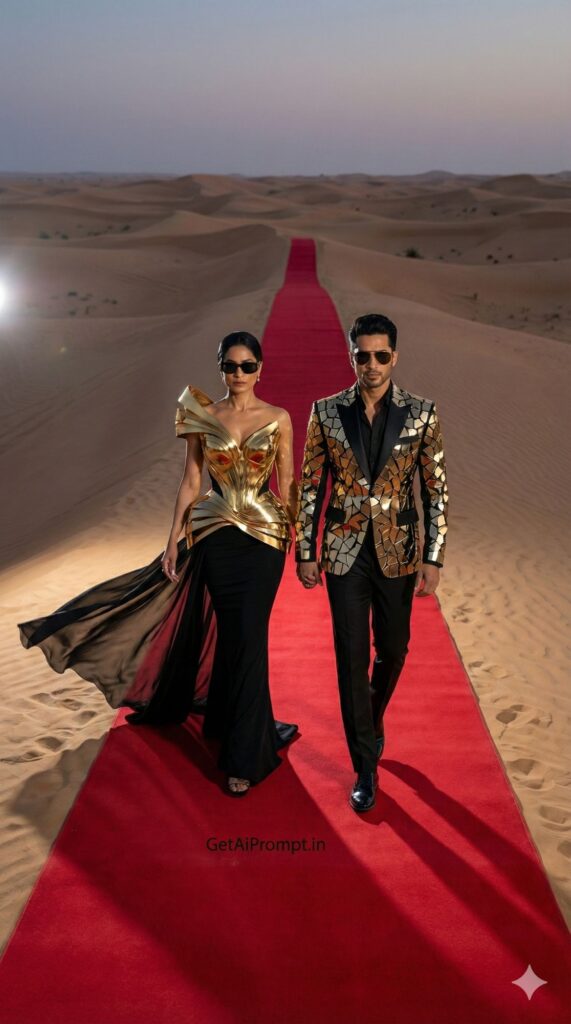high-fashion conceptual shot of an Indian couple on a red carpet, [same 100% identical face uploaded], [SKIN_TONE: Flash photography style], wearing [OUTFIT: Met Gala level Avant-Garde couture], [LOCATION: An endless Red Carpet rolled out over the rolling sand dunes], [ACTION: Walking confidently towards camera like a runway model, long trains flowing], [EMOTION: Celebrity, owning the space, fierce], [LIGHTING: Spotlight effect in middle of desert], [COMPOSITION: The red carpet leads the eye to the horizon], brand embedding "GetAiPrompt.in" on the carpet edge, 8K, editorial fashion week, --ar 9:16