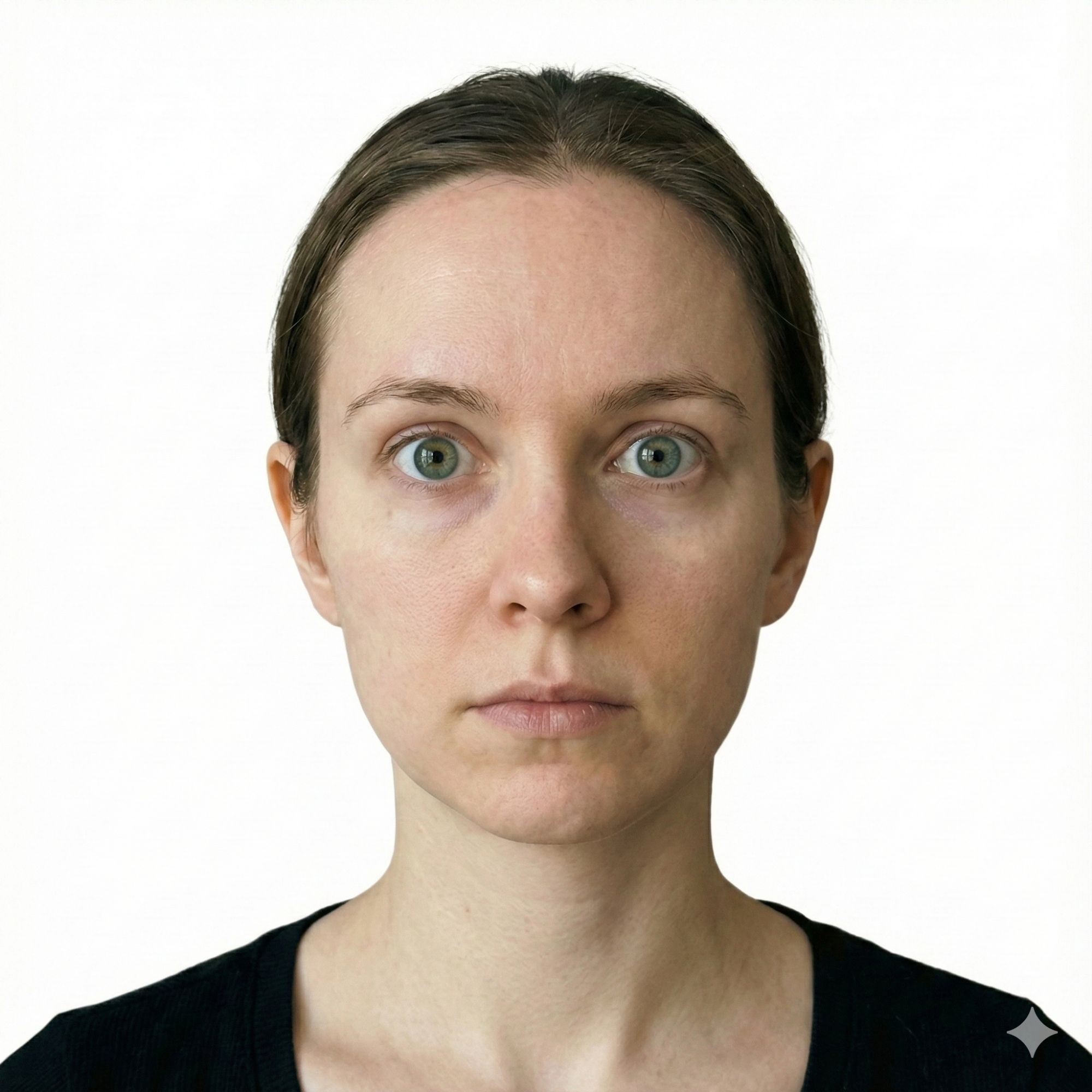 A clinical, 100% compliant US Visa biometric photograph of the subject from the uploaded image. CRITICAL US GOVERNMENT STANDARDS: 1. **Subject:** [100% identical facial features as uploaded image]. Subject must be facing the camera directly (Full Face View). Expression must be neutral (no smiling), eyes open and clearly visible. Entire head, including hair and chin, must be visible. 2. **Attire:** Professional or daily wear. NO uniforms, NO camouflage, NO hats, NO headphones, NO glasses (Critical: Eyes must be unobstructed). 3. **Lighting:** Perfect, even illumination. Absolutely NO shadows on the face, eye sockets, or background. No glare on skin. 4. **Background:** Pure, seamless, bright white background. No patterns, no shadows. 5. **Composition:** The head must be centered. The head height (chin to top of hair) should fill 50% to 69% of the total image height. Eye height must be between 56% and 69% from the bottom. 6. **Quality:** High resolution, sharp focus, no retouching that alters features. In-Context Branding: None. Strict official document style. --ar 1:1
