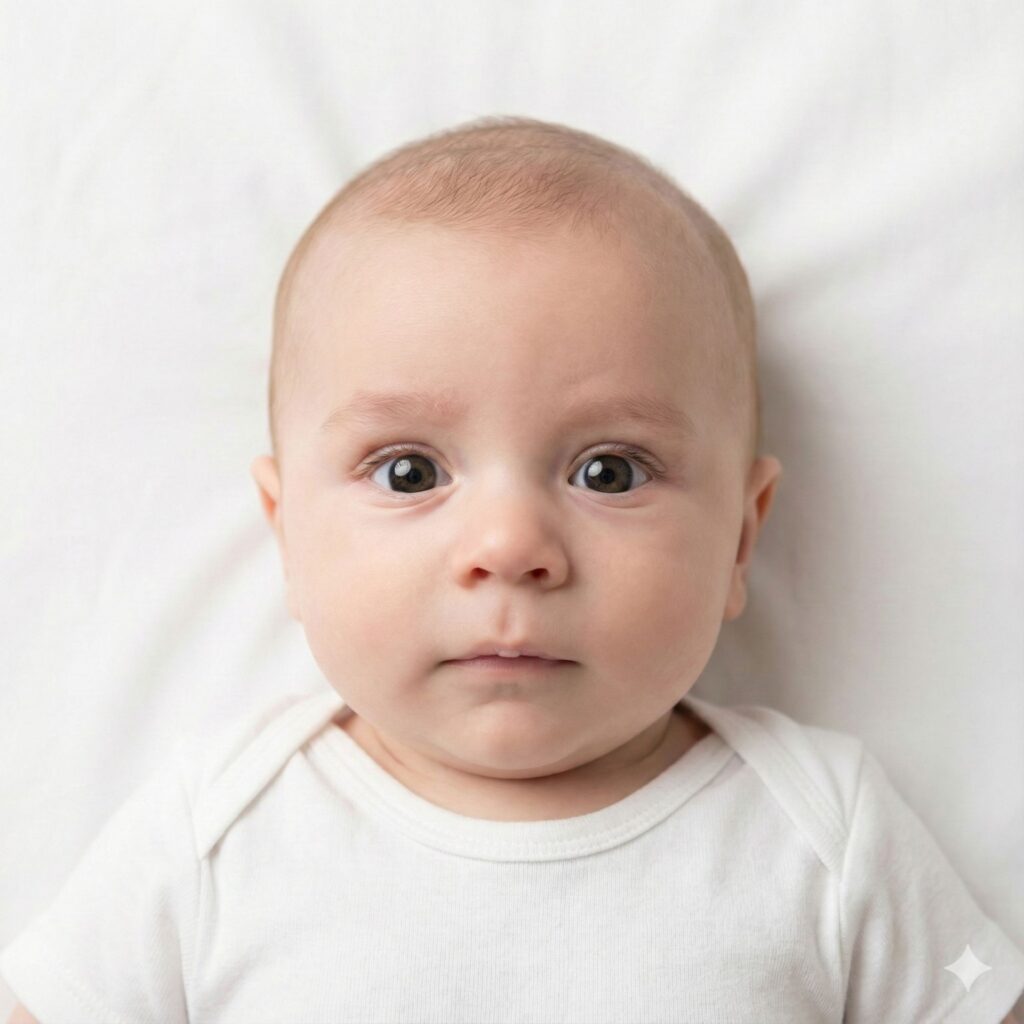 A compliant infant Visa photograph of a baby [Subject from uploaded image]. CRITICAL ADJUSTMENTS: 1. **Pose:** The baby is lying on its back on a plain white sheet, looking directly at the camera. Eyes are open. 2. **Support:** NO hands holding the baby are visible. No toys or pacifiers in the frame. 3. **Face:** Mouth is closed (or naturally relaxed). Head is not tilted. 4. **Lighting:** Soft, diffused light to ensure no harsh shadows on the baby's face or the background sheet. 5. **Background:**Full Pure white and clean and wrinkle-free. Standard: Strict biometric compliance for infant travel documents. --ar 1:1