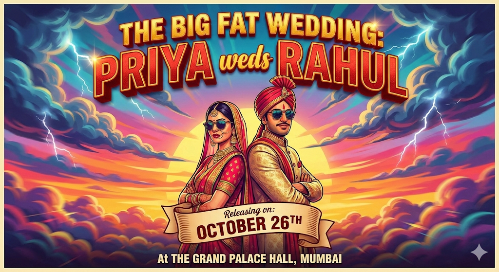 "A Bollywood movie poster style wedding invite. The couple standing back to back in sunglasses with dramatic clouds. Large bold title text at the top reads: 'THE BIG FAT WEDDING: [Bride Name] weds [Groom Name]'. Releasing on: '[Date]'. At [Venue Name]. Vibrant blockbuster aesthetic."