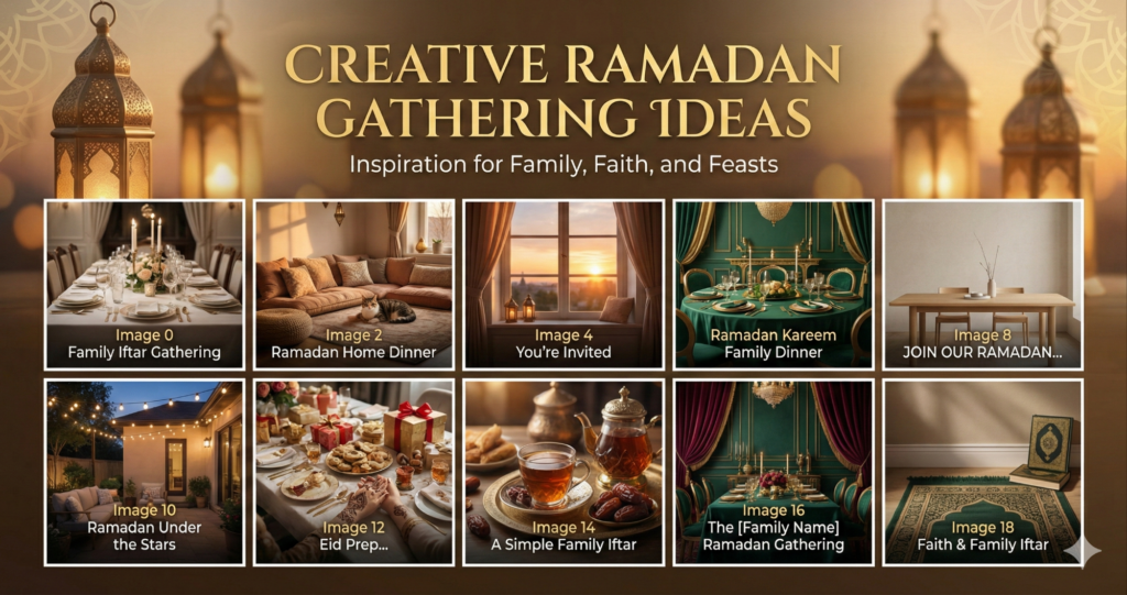 3. What Gemini Does Differently: Gemini typically offers exceptional handling of soft, environmental lighting and high-fidelity text integration. You can leverage this by asking Gemini to generate the image with your specific English headers (like “Family Iftar Gathering”) already perfectly rendered in a serif font right on the image.
