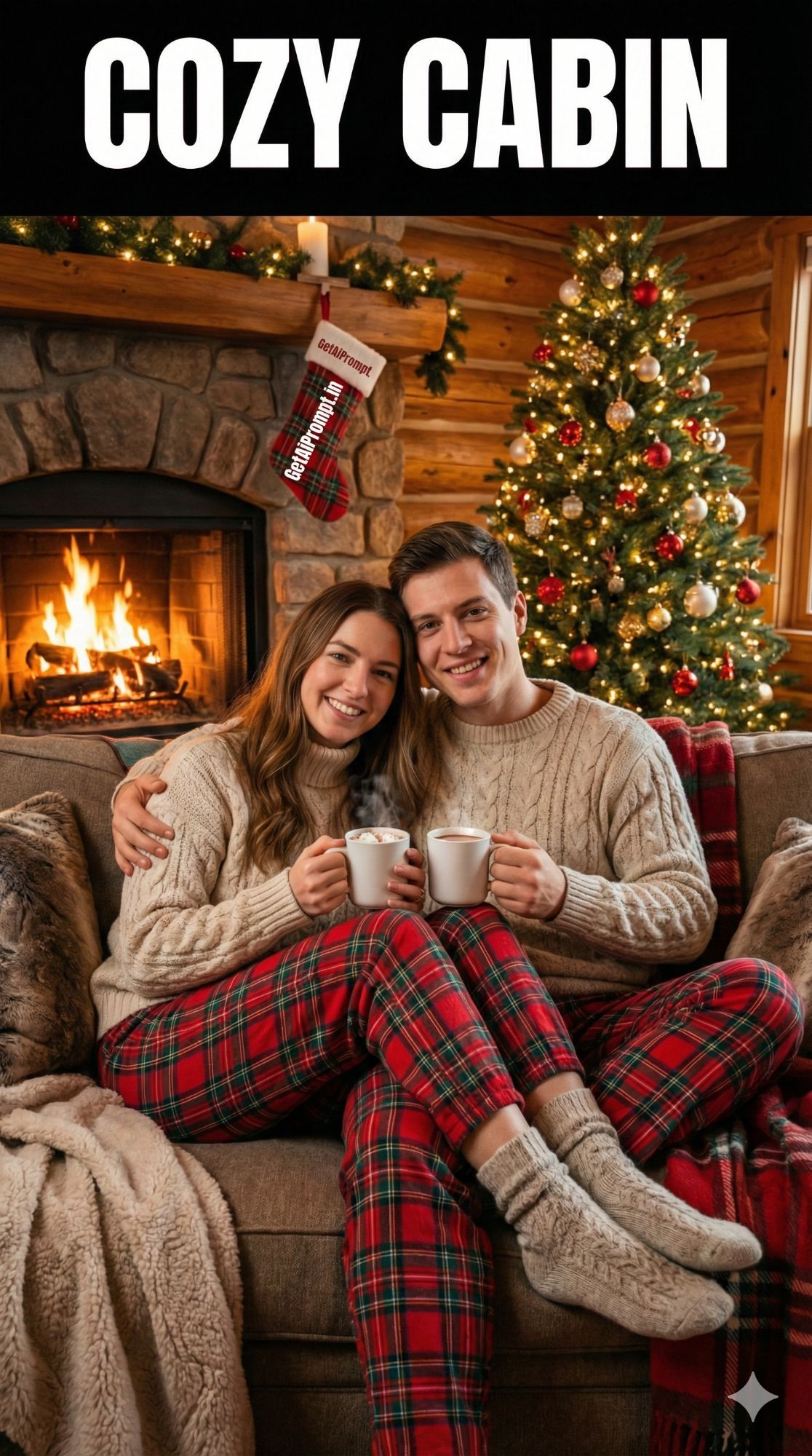A deeply cozy, warm interior shot based on the uploaded image, showing the couple with [100% identical and same faces for both subjects in uploaded images]. They are cuddling intimately on a plush sofa covered in blankets in front of a roaring fireplace in a [LOCATION: Rustic Log Cabin, festive Airbnb]. A decorated Christmas tree glows beside them. They are wearing [OUTFIT: matching plaid holiday pajamas, oversized cable-knit sweaters and socks]. They are holding mugs of hot cocoa. Embedded Branding: The text "GetAiPrompt.in" is embroidered on a Christmas stocking hanging on the mantelpiece. Top Bar: A horizontal black bar at the very top edge containing the text "COZY CABIN" in bold white cinematic font. --ar 9:16