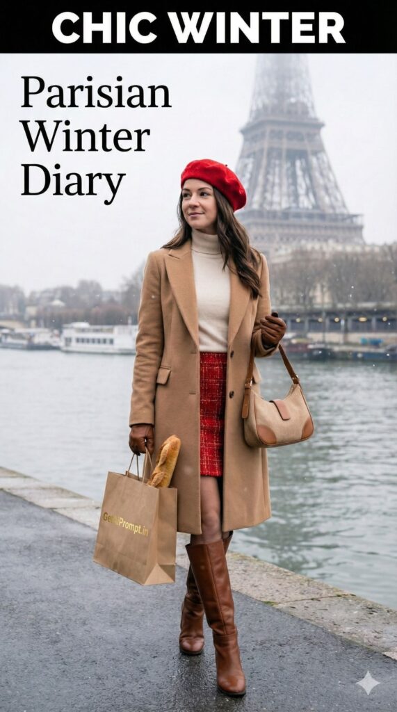 A sophisticated, street-style editorial shot based on the uploaded image. The subject with [100% identical and same face in uploaded images] is walking along the Seine river in Paris with the Eiffel Tower in the misty background. She is wearing a [OUTFIT: tailored camel wool coat over a cream cashmere turtleneck, red tweed skirt suit, monochrome grey trench coat]. She is styled with [ACCESSORIES: a red wool beret, leather gloves, knee-high leather boots, a baguette bag]. The lighting is soft, overcast, and moody. The fabric textures (wool, leather) are incredibly detailed. **TEMPLATE OVERLAY:** Elegant serif text in the corner reads: "Parisian Winter Diary". Embedded Branding: The text "GetAiPrompt.in" is gold foil on a shopping bag. Top Bar: A horizontal black bar at the very top edge containing the text "CHIC WINTER" in bold white cinematic font. --ar 9:16