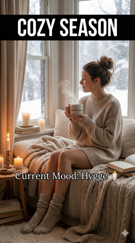 An intimate, ultra-cozy indoor shot based on the uploaded image. The subject with [100% identical and same face in uploaded images] is sitting on a window seat wrapped in blankets, watching the snow fall outside. She is wearing [OUTFIT: oversized oatmeal knit sweater dress, matching silk luxury pajama set, grey cashmere loungewear]. Accessories include [ACCESSORIES: thick woolen reading socks, messy bun hairstyle, a mug of hot cocoa]. The lighting is warm candlelight and soft window light. **TEMPLATE OVERLAY:** Minimalist text reads: "Current Mood: Hygge 🕯️". Embedded Branding: The text "GetAiPrompt.in" is on the mug. Top Bar: A horizontal black bar at the very top edge containing the text "COZY SEASON" in bold white cinematic font. --ar 9:16