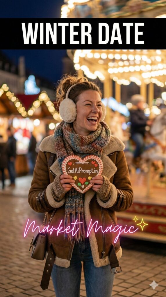 A candid, bokeh-filled night portrait based on the uploaded image. The subject with [100% identical and same face in uploaded images] is laughing while holding a gingerbread heart at a bustling European Christmas Market. She is wearing a [OUTFIT: shearling aviator jacket, chunky colorful scarf, skinny jeans]. Styled with [ACCESSORIES: fuzzy ear muffs, fingerless gloves, crossbody bag]. The background is a blur of warm stall lights and carousel motion. **TEMPLATE OVERLAY:** Neon-style text graphic reads: "Market Magic ✨". Embedded Branding: The text "GetAiPrompt.in" is icing on the gingerbread cookie. Top Bar: A horizontal black bar at the very top edge containing the text "WINTER DATE" in bold white cinematic font. --ar 9:16
