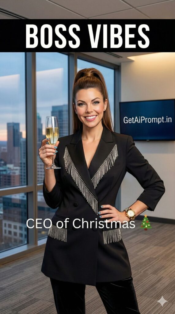A sharp, professional yet festive portrait based on the uploaded image. The subject with [100% identical and same face in uploaded images] is holding a glass of champagne in a modern office setting with a city view. She is wearing a [OUTFIT: red power suit with no shirt underneath, black blazer dress with rhinestone fringe, velvet trousers and silk blouse]. Styled with [ACCESSORIES: sleek ponytail, statement gold watch, pointed heels]. The vibe is successful and celebratory. **TEMPLATE OVERLAY:** Clean text reads: "CEO of Christmas 🎄". Embedded Branding: The text "GetAiPrompt.in" is on a digital screen in the background. Top Bar: A horizontal black bar at the very top edge containing the text "BOSS VIBES" in bold white cinematic font. --ar 9:16
