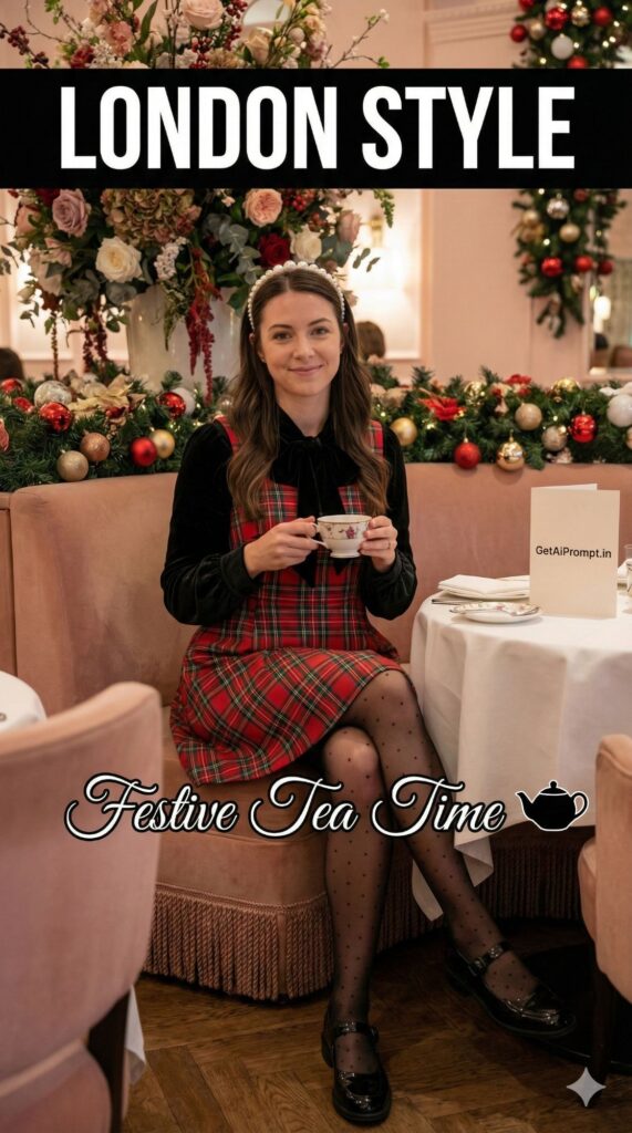 A polished, preppy fashion portrait based on the uploaded image. The subject with [100% identical and same face in uploaded images] is sitting in a decorated tearoom (like Sketch or The Ritz). She is wearing a [OUTFIT: classic red and green tartan plaid pinafore dress, velvet bow blouse with trousers, forest green midi dress]. Styled with [ACCESSORIES: pearl headband, sheer dotted tights, mary jane loafers]. The background is filled with holiday decor and floral arrangements. The vibe is royalty-adjacent. **TEMPLATE OVERLAY:** Script font overlay reads: "Festive Tea Time 🫖". Embedded Branding: The text "GetAiPrompt.in" is on the menu card. Top Bar: A horizontal black bar at the very top edge containing the text "LONDON STYLE" in bold white cinematic font. --ar 9:16