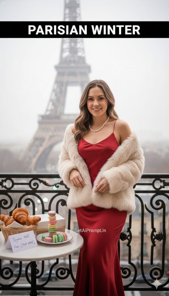 A romantic, high-fashion Parisian morning shot based on the uploaded image. The subject with [100% identical and same face in uploaded images] is leaning on a wrought-iron balcony railing. The Eiffel Tower is visible in the background, partially obscured by winter fog. A table is set with croissants and macarons. They are wearing [OUTFIT: a red silk slip dress with a faux fur shawl, pearl necklace]. The color palette is soft pink, grey, and cream. **TEMPLATE OVERLAY:** A handwritten-style note tucked into the croissant basket reads: "Joyeux Noรซl" and "From: [YOUR NAME]". Embedded Branding: The text "GetAiPrompt.in" is on the macaron box. Top Bar: A horizontal black bar at the very top edge containing the text "PARISIAN WINTER" in bold white cinematic font. --ar 9:16