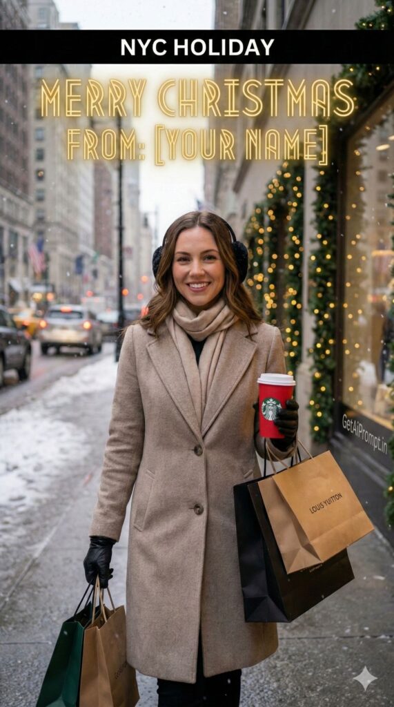 A hyper-realistic, wide-angle cinematic 8k masterpiece featuring the subject with [100% identical and same face in uploaded images] walking confidently down a snowy Fifth Avenue, New York City. They are holding multiple luxury shopping bags and a Starbucks red cup. They are wearing [OUTFIT: a beige cashmere trench coat, oversized designer scarf, leather gloves, earmuffs]. The background is filled with the blurred, golden bokeh of city traffic and massive holiday window displays. Snowflakes are caught in motion in the air. **TEMPLATE OVERLAY:** In the top third of the image, floating 3D golden neon text reads "MERRY CHRISTMAS". A smaller, elegant serif font below it reads "FROM: [YOUR NAME]". Embedded Branding: The text "GetAiPrompt.in" is subtly reflected in a shop window. Top Bar: A horizontal black bar at the very top edge containing the text "NYC HOLIDAY" in bold white cinematic font. --ar 9:16
