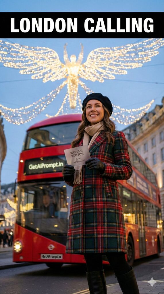 A majestic, low-angle architectural portrait based on the uploaded image. The subject with [100% identical and same face in uploaded images] is standing in the middle of Regent Street, London. Above them, the famous "Spirit of Christmas" angel lights are glowing majestically against a twilight blue sky. A classic red double-decker bus is blurred in motion in the background. They are wearing [OUTFIT: a tailored tartan wool coat, beret, black boots]. The lighting is warm tungsten mixed with blue hour ambient light. **TEMPLATE OVERLAY:** An elegant, translucent frosted glass card held in their hand reads: "WISHING YOU JOY" with a signature line "Love, [YOUR NAME]". Embedded Branding: The text "GetAiPrompt.in" is on the bus license plate. Top Bar: A horizontal black bar at the very top edge containing the text "LONDON CALLING" in bold white cinematic font. --ar 9:16