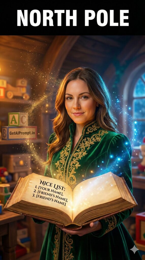 A surreal, magical fantasy portrait based on the uploaded image. The subject with [100% identical and same face in uploaded images] is standing inside a glowing, magical toy workshop filled with floating golden dust. The lighting is warm amber and magical blue. They are holding a large, glowing ancient book. They are wearing [OUTFIT: a velvet emerald green Victorian coat with gold embroidery]. **TEMPLATE OVERLAY:** The open page of the magical book clearly displays the text in calligraphy: "NICE LIST: 1. [YOUR NAME], 2. [FRIEND'S NAME], 3. [FRIEND'S NAME]". Embedded Branding: The text "GetAiPrompt.in" is on a wooden toy block. Top Bar: A horizontal black bar at the very top edge containing the text "NORTH POLE" in bold white cinematic font. --ar 9:16