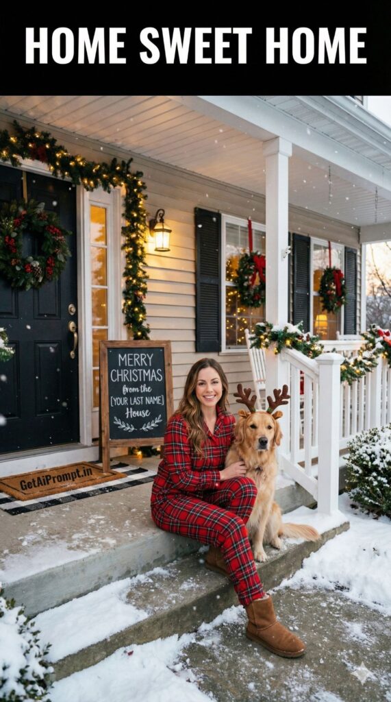A wholesome, wide-angle "Home for the Holidays" shot based on the uploaded image. The subject with [100% identical and same face in uploaded images] is sitting on the steps of a beautifully decorated American suburban front porch. A Golden Retriever with a reindeer headband is sitting next to them. The house is covered in wreaths and lights. It is snowing gently. They are wearing [OUTFIT: matching red plaid pajamas and Ugg boots]. **TEMPLATE OVERLAY:** A rustic wooden chalkboard sign leaning against the door reads: "MERRY CHRISTMAS from the [YOUR LAST NAME] House". Embedded Branding: The text "GetAiPrompt.in" is on the doormat. Top Bar: A horizontal black bar at the very top edge containing the text "HOME SWEET HOME" in bold white cinematic font. --ar 9:16